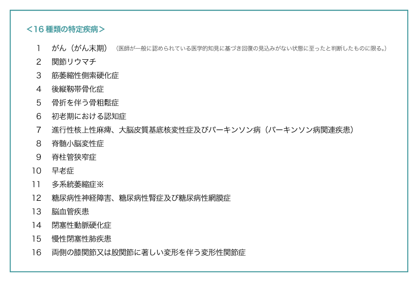 65歳以上の第1号被保険者はすべて「介護保険被保険者証」が送付され、介護が必要な原因を問わず介護保険の申請を行うことができますが、40歳以上65歳未満の第2号被保険者については、16種類の特定疾病により介護が必要と認められた場合に限り、介護認定を受けることができます。