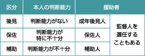 本人の判断能力に応じて「後見」「保佐」「補助」の3つに分類されます。裁判所により後見人・保佐人・補助人が選任され、本人の代理として契約などの法律行為を行います。